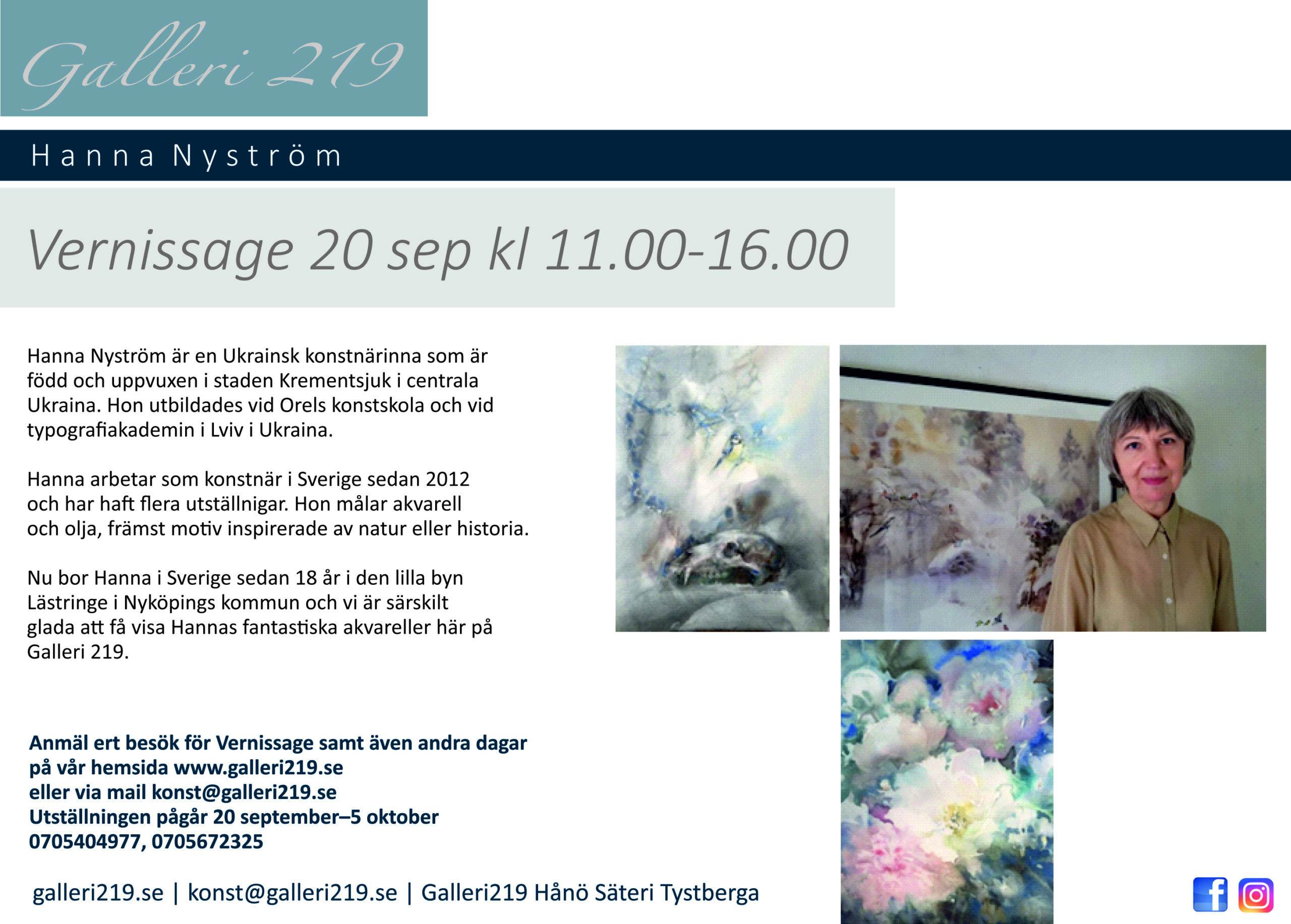Galleri 219 är ett annorlunda Galleri med utställningar och konstkvällar som ni som intresserade bjuds in till för att se och uppleva bra konst på förutbestämda tider. Vi kommer att anordna separata utställningar samt temautställningar
